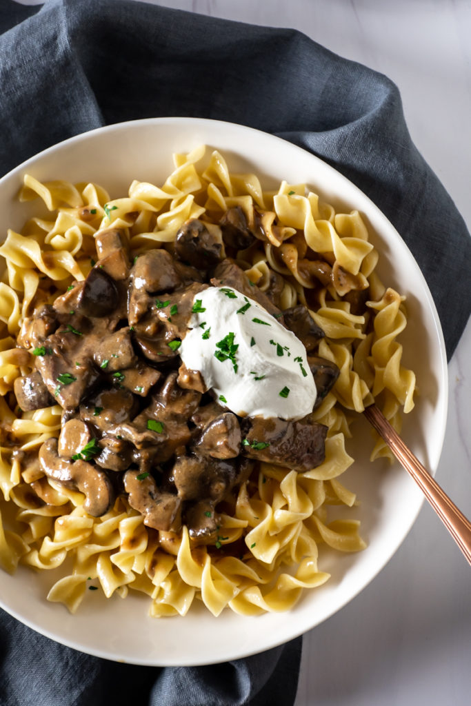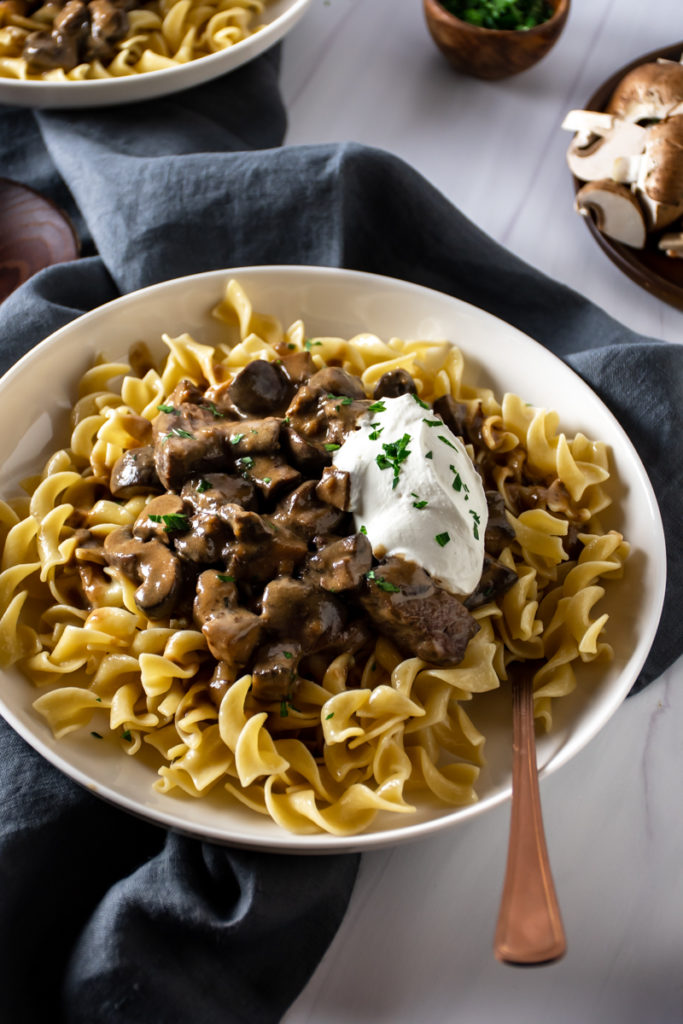 Beef roast, mushrooms, red wine, garlic, and sour cream make this Beef Stroganoff a rich, comforting meal that is perfect for a chilly winter day.