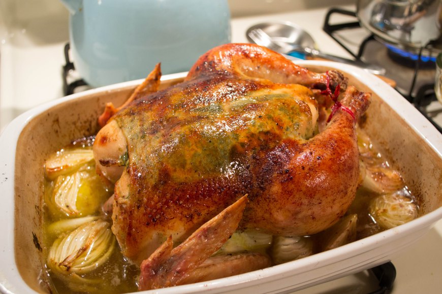Roast Chicken with Herb Butter Credit: Best of the Best Cookbook Recipes by Food & Wine, Original recipe from New Classic Family Dinners by Mark Peel Ingredients: 1 fat garlic clove, cut in half,green shoot removed kosher salt 4 teaspoons roughly chopped chervil 1 tablespoon roughly chopped tarragon 1 teaspoon roughly chopped thyme leaves 2...